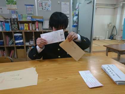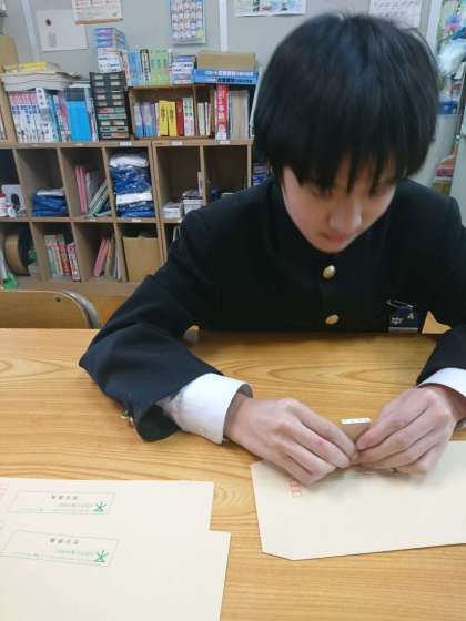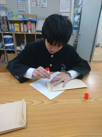 封筒にゴム印をまっすぐ押します。資料を三つ折りにして、向きを確認して封筒に入れます。間違いがないことを確認して、糊付けします。