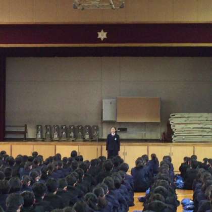 続いて、風紀委員から、各学年の風紀目標が決まった事と、また、生徒会からは、先日の生徒議会で話し合った、挨拶についての話がありました。今後もさらにより良い東中していくために、全校生徒で協力しましょう。