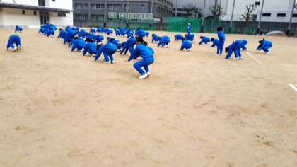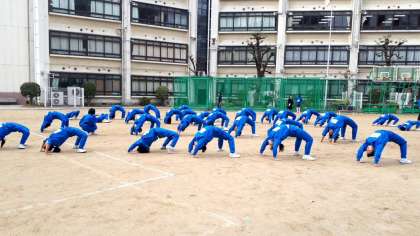 今日はまた冷たい風が吹いていますが、運動場では、1年生が体育の授業に取り組んでいます。基礎体力づくりのトレーニングをしていますが、大きく元気な声を出し合い、気合い全開です!