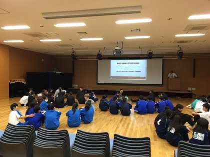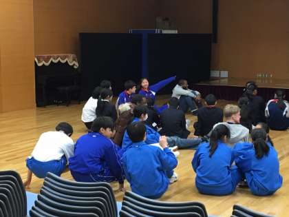 次は、クイズです。相談して答えを考えています。同じグループになった他の中学校の生徒とも、仲良くなりました。