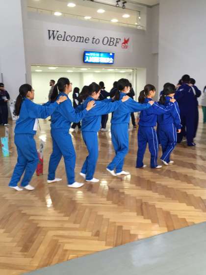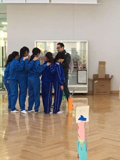最後は迷路。先頭が目隠しをして、後ろの人は英語で道案内をします。ハテナ?にたどり着くと英語の質問に答えて進みます。