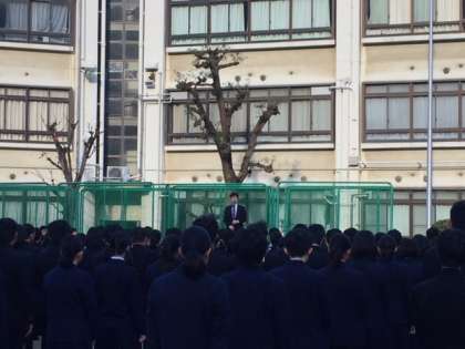 さて、先ほど技術部に表彰状の伝達をしました。第17回「アイデアロボットコンテスト」大阪市中学生大会兼近畿大会に出場し、決勝トーナメントに東中は4チームが勝ちあがり、最終的にはベスト8、ベスト4、そして優勝と各チームが素晴らしい結果を残してくれました。本当におめでとう!というお話は、いつも各部の表彰状の伝達の際に紹介をしています。今回、技術部はそれだけではありません。昨年、部活動内で仲間の大切さについて改めて考えなくてはならないことがあり、夏休み後半から12月まで部活動を自粛することがありました。そのため、現在の高校1年生は、今回の大会も出場を辞退しました。技術部の3、2年生も同様でした。あれから1年、技術部の皆さんは、その反省を活かし、あきらめず、活動してきました。生まれ変わった技術部が今回の大会参加への思い入れや決意、意気込みには熱いものがあったと思います。特に3年生にとっては最後の大会、様々な気持ちがあったと思いを抱き、そのすべてを大会にぶつけ、素晴らしい結果をもたらしました。そして全国大会出場という快挙を成し遂げました。出場は1チームですが、技術部全員で勝ち取った栄誉です。全国大会に出場するチームの皆さんは東中技術部、いや東中生を代表して、「誇りを胸に受け継げ東」の魂で全国大会に挑んでください。来年1月、素晴らしい結果の報告を楽しみにしています。