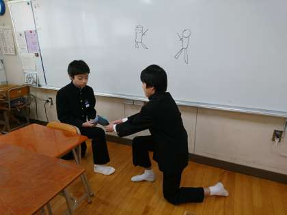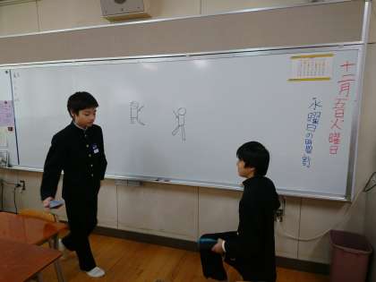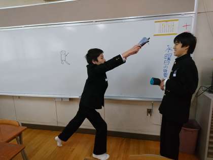生徒たちが体育の授業のことを話しています。剣道の授業がスタートしたようで、剣道の構えや礼儀作法について互いに話をしています。「次の授業では、どんなことをするのかな?」と前向きです!
