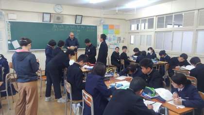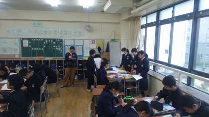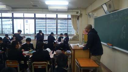本日2限目の4組の英語は、アーネストの先生の授業です。tongue twister(早口言葉)による発音テストを行っています。