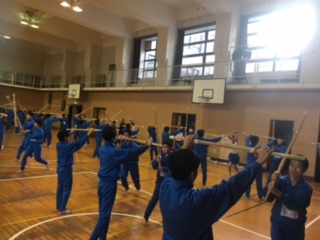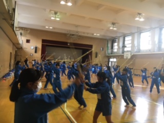 本日の授業では、正面素振りと跳躍素振りについて学んでいます。受ける人と打つ人に分かれて、ペアで協力して練習しています。
