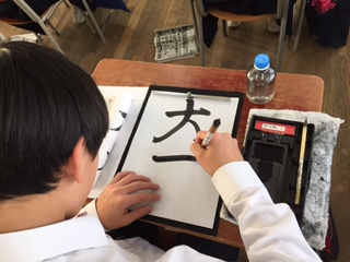 この時間は書写です。毛筆を用い「大木」と行書で書いています。