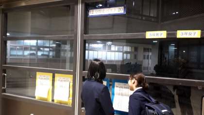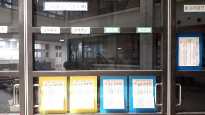 東中ホールに、体育科の授業で行った、12分間走、長距離走、走り幅跳びのベスト20の記録者が掲示されています。
