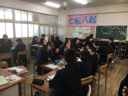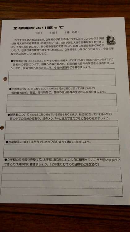 学期末ということで1年生は振り返りを行っています。まずは個人で2学期の振り返りを、その後各班に分かれて反省や課題、よかったことを話し合います。そしてすべての班の発表から学級としてのよかった点、課題、残り少ない3学期をどう過ごしていくのかを学級代表がまとめて学年集会での発表することになっています。