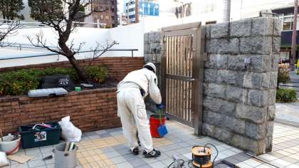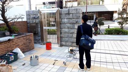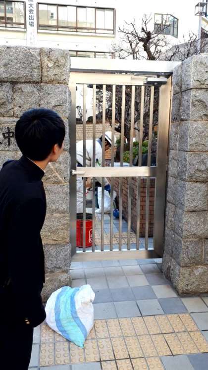 本日、老朽化してきた小門をリニューアルしています。東中生を始め本校を訪問していただく皆さまにより快適に、そして安全や防犯を重視したものを採用しています。夕刻には完成し、明日の登校時から使用します。