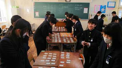 2限 2年1組では百人一首大会に向けての練習がおこなわれています。