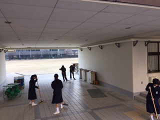写真は4組の生徒が、玄関及びピロティの掃除をしている様子です。