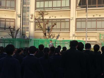今週末、生徒会の代表が文部科学省主催の「全国いじめ問題子どもサミット」に参加します。「いじめは絶対に許さない、東中からいじめをなくす」取り組みを報告してくれます。先ほどの阪神淡路大震災の話にも触れましたが、いじめによって命をも奪うことがあります。「命の大切さを知り、思いやりの素晴らしさ」を身につけた人になってください。