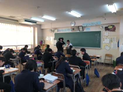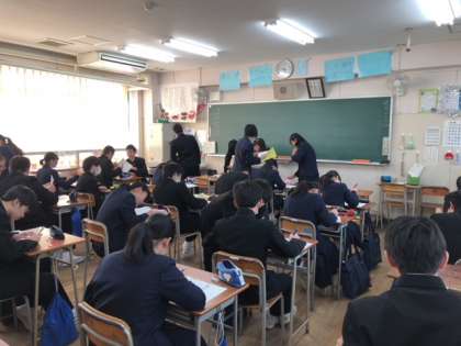 本日、1限目に私立高校の願書作成を行いました。終わった生徒は、各自、問題集や過去問を解いていました。写真は、1・2・3組の様子です。