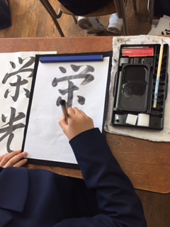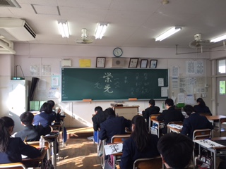 本日の国語は書写でした。毛筆を用いて「栄光」と行書で書く練習をしました。心穏やかに落ち着いて取り組むことができました。