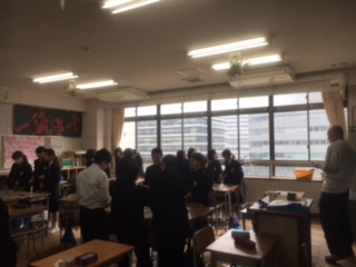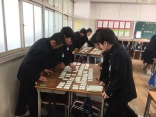 1年生5.6時間目は百人一首大会の練習です。いよいよ大会まであと1週間です。各クラス盛り上がっています!1組では、男女別の班で対戦しています。写真はスタート前の記憶タイム、そして対戦している様子です。