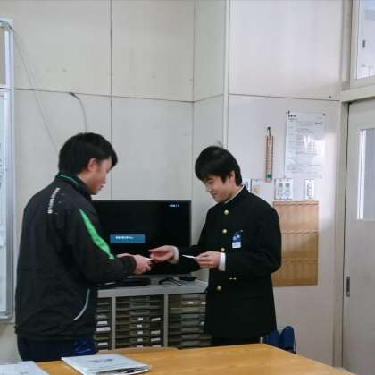実習中に名刺の渡し方を教わった班もありました。違う班で実習した生徒は、また授業のなかで学んでいきます。