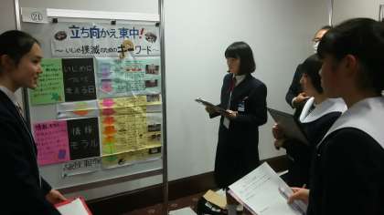 発表のあと、 他の児童・生徒、先生方から質問を受け付けました。東中学校には、特に情報モラルへの取り組みに多く質問をいただきました。さらに質問だけでなく、アドバイスももらえないか、積極的に聞きました。