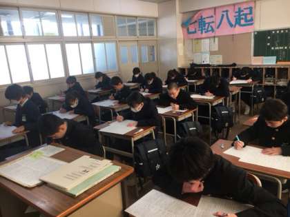 本日、1・2年生は第2回の実力テストに臨んでいます。写真へ1年生の様子です。1時間目は国語です。真剣に問題と向き合っています。
