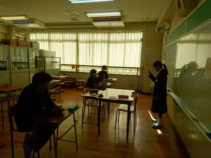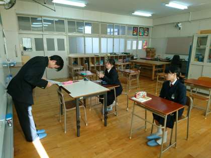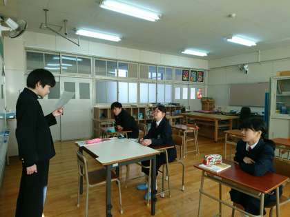 前に出て、1人ずつ発表しています。1学期は恥ずかしがってしまったり、声がとても小さかったりした生徒も、最近では堂々と発表できるようになってきました。発表を聞く時も、発表者を見ながら聞くことができていますね!