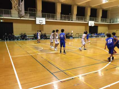 第1試合の東中学校-今津中学校の試合は後半に入っています。接戦になっています。今、2年生の逆転3ポイントシュートが決まりました!