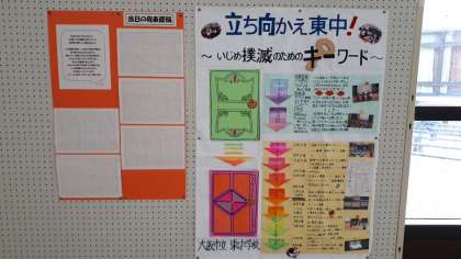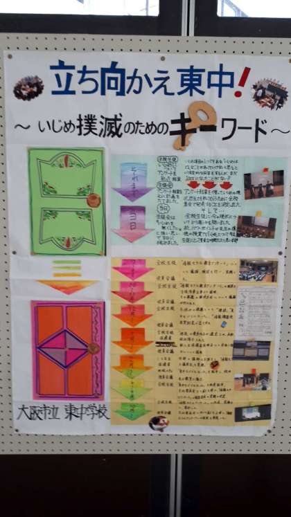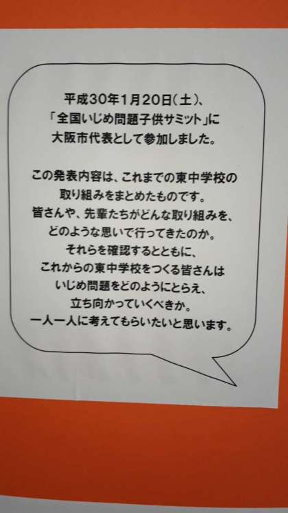 〜いじめ撲滅のキーワード〜と題し、東中生徒会が、東京都で開催された、文部科学省主催「いじめ問題子供サミット」に、大阪市の代表として参加し、発表した内容が東中ホールに展示されています。その内容は関係者の皆さんから多くのお褒めのお言葉と激励のお言葉をいただきました!