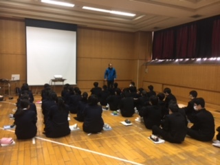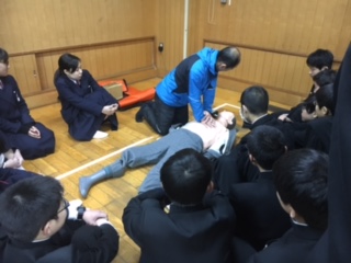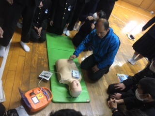 本日2年3組の保健体育は心配蘇生法の実習に取り組みます。始めに西邨先生から、胸骨圧迫とAEDの使い方について説明がありました。