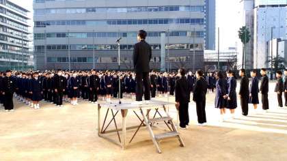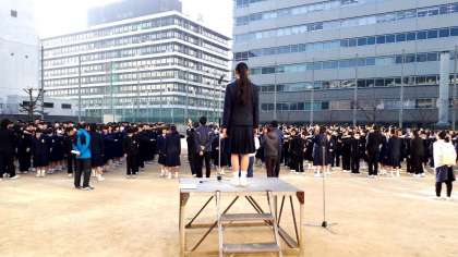先週はインフルエンザ等で学級休業があり、全校集会も見合わせていました。今日は素晴らしい快晴の元、久しぶりの全校集会です。生徒会長の元気な声の合図で始まりま