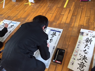 書き初めには少し時期が遅いですが、書初用紙にそれぞれ教科書から選んだ言葉を毛筆で書写しています。