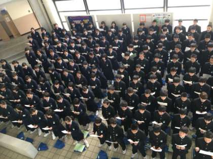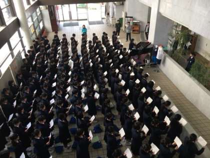 玄関ホールでの練習の様子です。徐々に声が出て、男女のハーモニーがはっきりしてきました!まだまだ出せるはず!3年生に素晴らしい歌を届けよう!!!