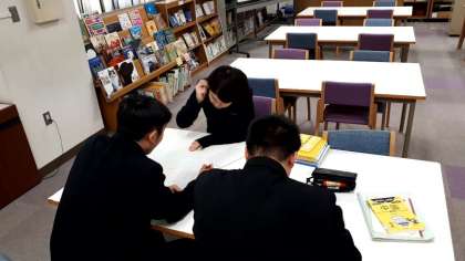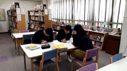 5時限目、図書室では、中国籍の仲間が、日本語取得のために、熱心に学習しています。東中では、センター校だけではなく、学校独自に学び場を開設しています。