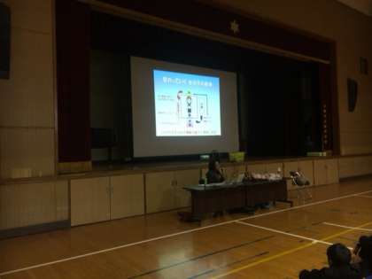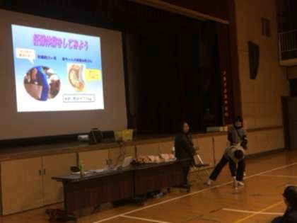 保健委員が妊婦体験をしています。靴ひもを結んだり、落とした物を拾っています。とても窮屈そうですね。続いて助産師から男女の身体の変化についてのお話です。
