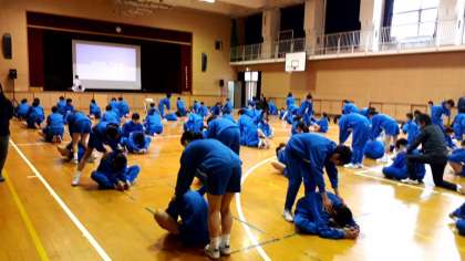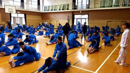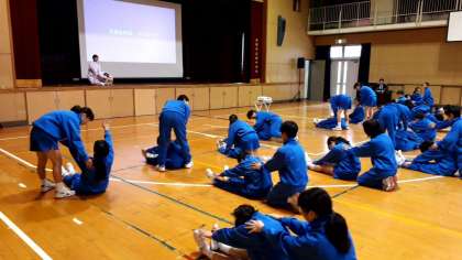 大切なのはストレッチ!ダンス授業に入る前に、入念なストレッチをしています!皆さん、楽しそうにしています。