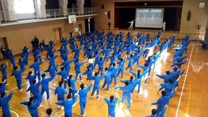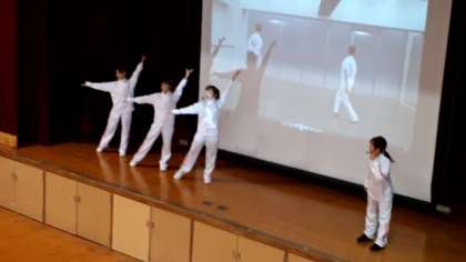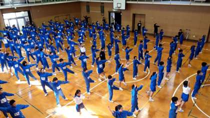 歌劇団の皆さんの模範演技を見せていただき、最後の決めポーズにチャレンジ!