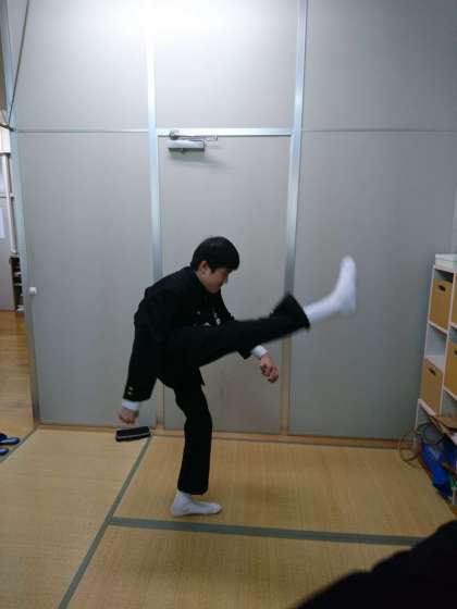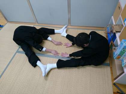 1・2年生が、今日のダンス授業について話しています。「こんなストレッチあったよね!」「どれくらい足あがってる?」など、とても楽しそうです。