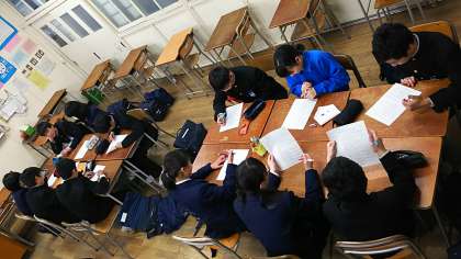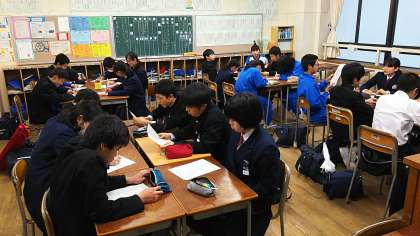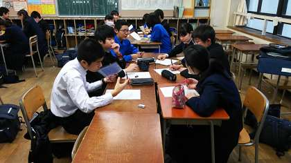 本日1限に行った『班別作文発表会』に引き続き、次は『学級作文発表会』に向けて班長会議を行っています。