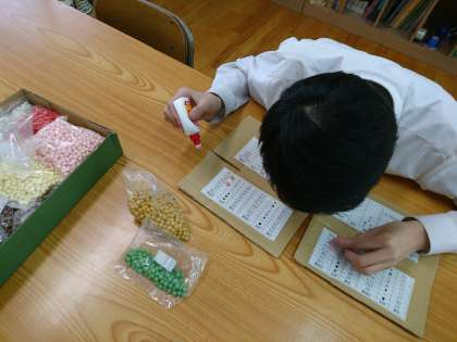 視覚と運動の協応動作の向上を目指し、「スキルスクリーン(玉のれん)」に取り組んでいきます。