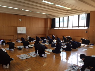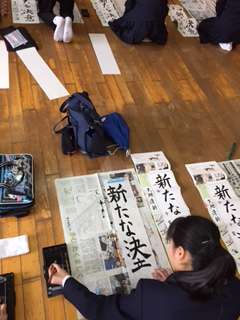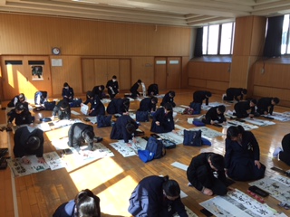 多目的室で書写の授業を行なう2回目です。この時間で清書を提出します。