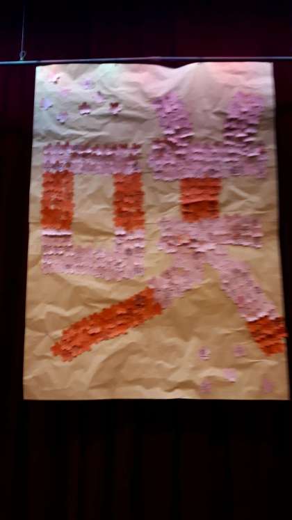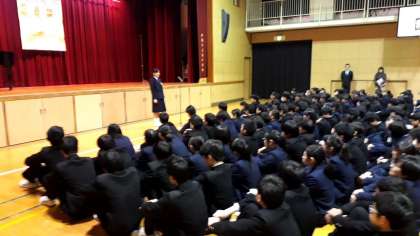 壇上に飾られた「咲」の文字には桜の花びらに、在校生、先生方のメッセージが記されています。
