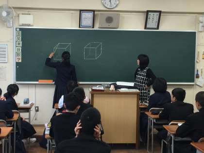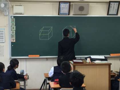 昨日パソコンを使って行った立方体の切断を今日は黒板で行なっています。