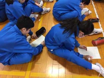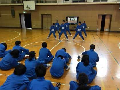4時間目は1年1組のダンス発表会を行なっています。どの班もオリジナリティーに富んだ構成で楽しませてくれます。またワークシートを用いて「チームワーク、基本ステップの完成度、多様性」の観点を相互評価しています。
