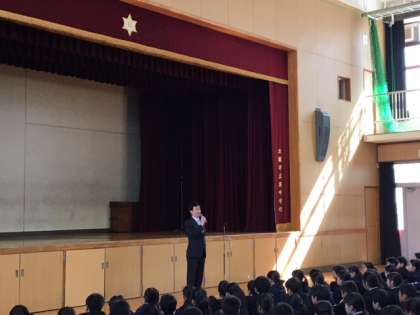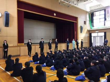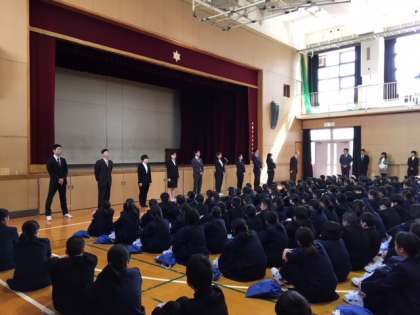 まず、新転任の先生方の着任式が行われ、紹介がありました。その後、生徒代表挨拶がありました。