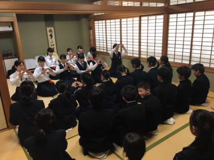 4階和室、茶道部に21名の1年生が体験入部に来ました。