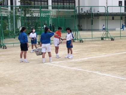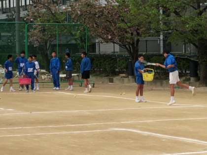 ソフトテニス部の仮入部が始まりました! 2年、3年の先輩が1年生の後輩に1から教えてくれています!