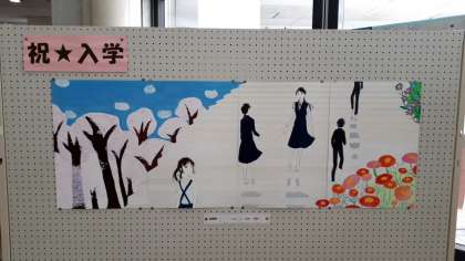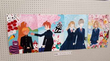 美術部の皆さんの作品がホールに掲示されています。
