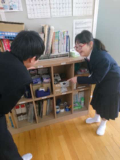 自分たちで「事務用品」のロッカーから、ラベルシールをつくる機械を取り出して準備します。