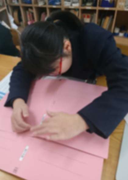 つくったラベルを、先生たちが使うファイルに丁寧に貼りました。