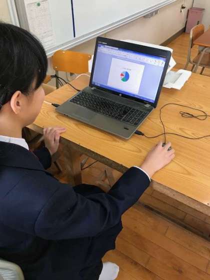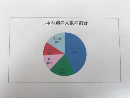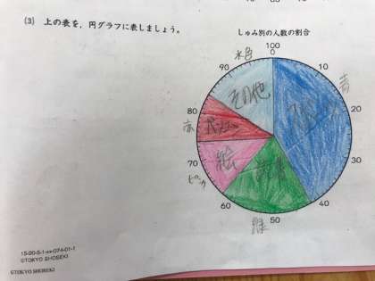 今回はパソコンのワープロソフトを使い、前回のグラフと同じ色や割合で円グラフを作りました。