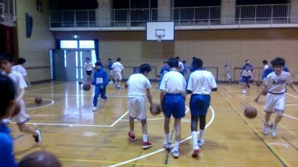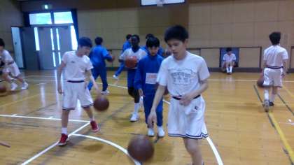 本日も男子バスケットボール部には10人の1年生が仮入部に来ています。2年生を中心に先輩らしく?!ドリブル練習を教えています。
