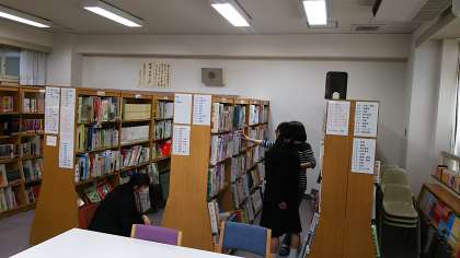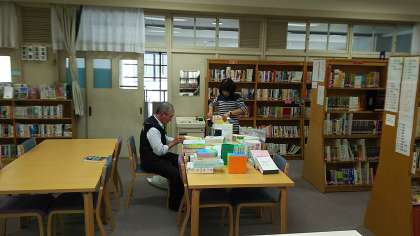放課後の図書館では、元気アップ支援員さんと2名の生徒たちにより、図書館の整備を行っていただいています。