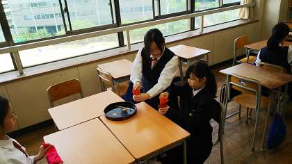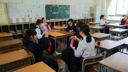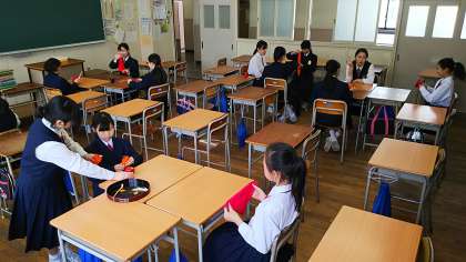 新入部員がたくさん入った茶道部は、和室では狭いため、教室で稽古に取り組んでいます。